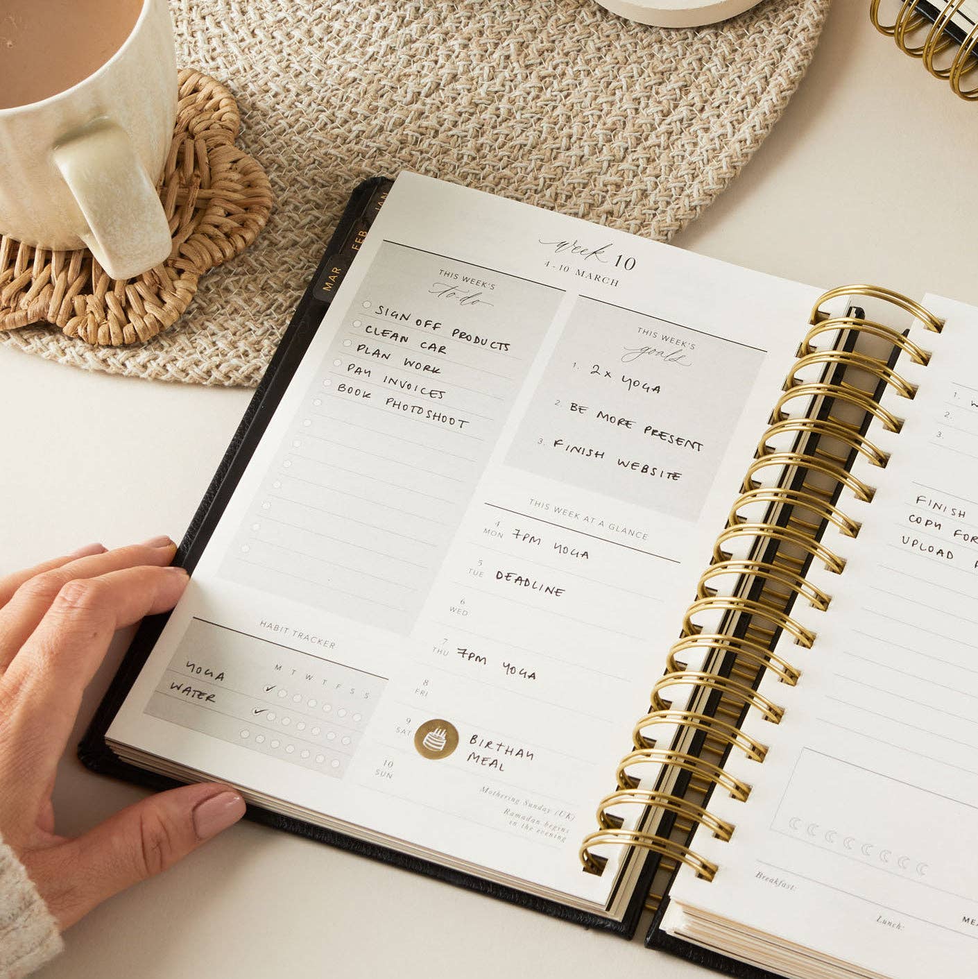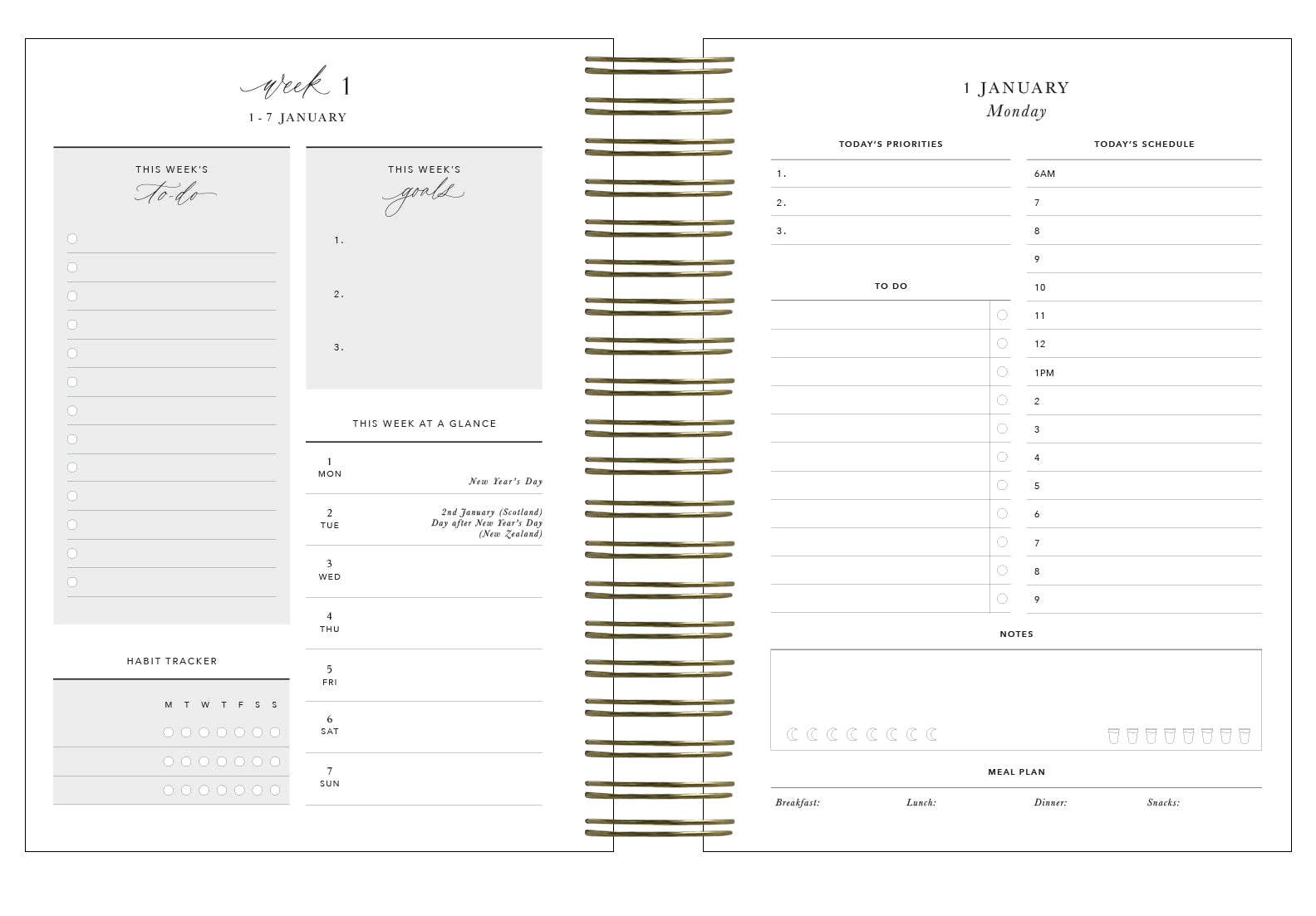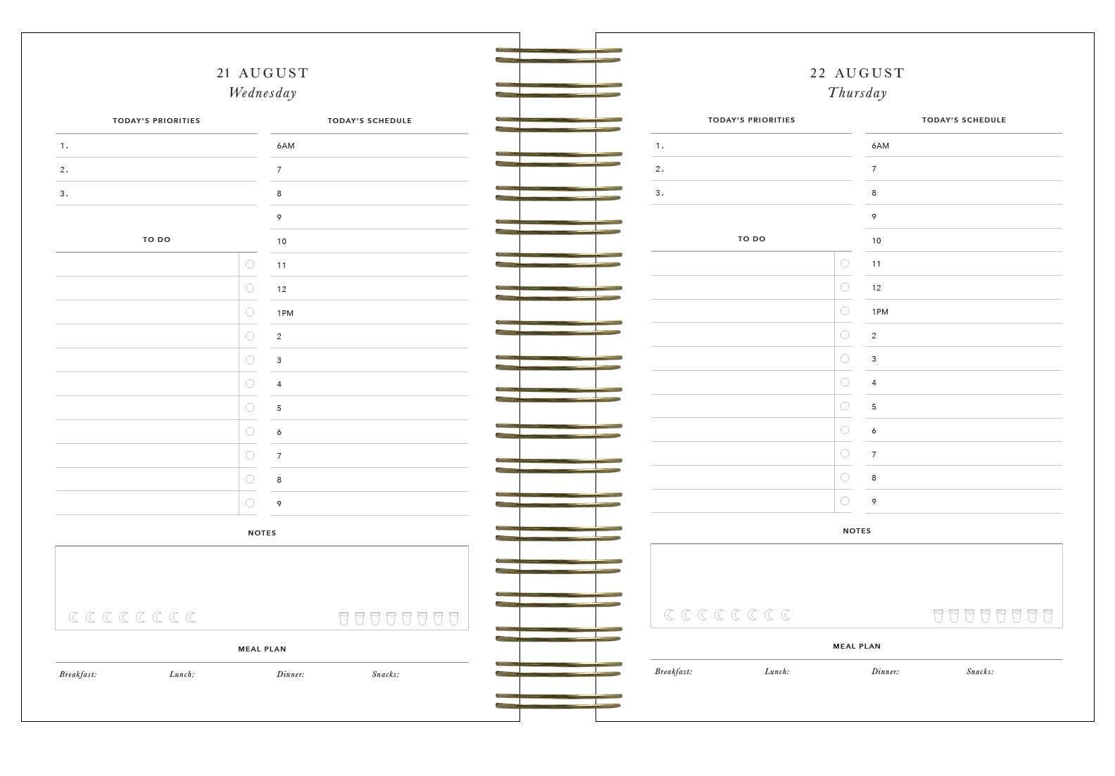 The 'day-to-page' view allows you to have all your plans for the day in one place (daily priorities, to-do lists and time blocking, as well as a section for your meal plan and to keep track of your sleep and water intake).