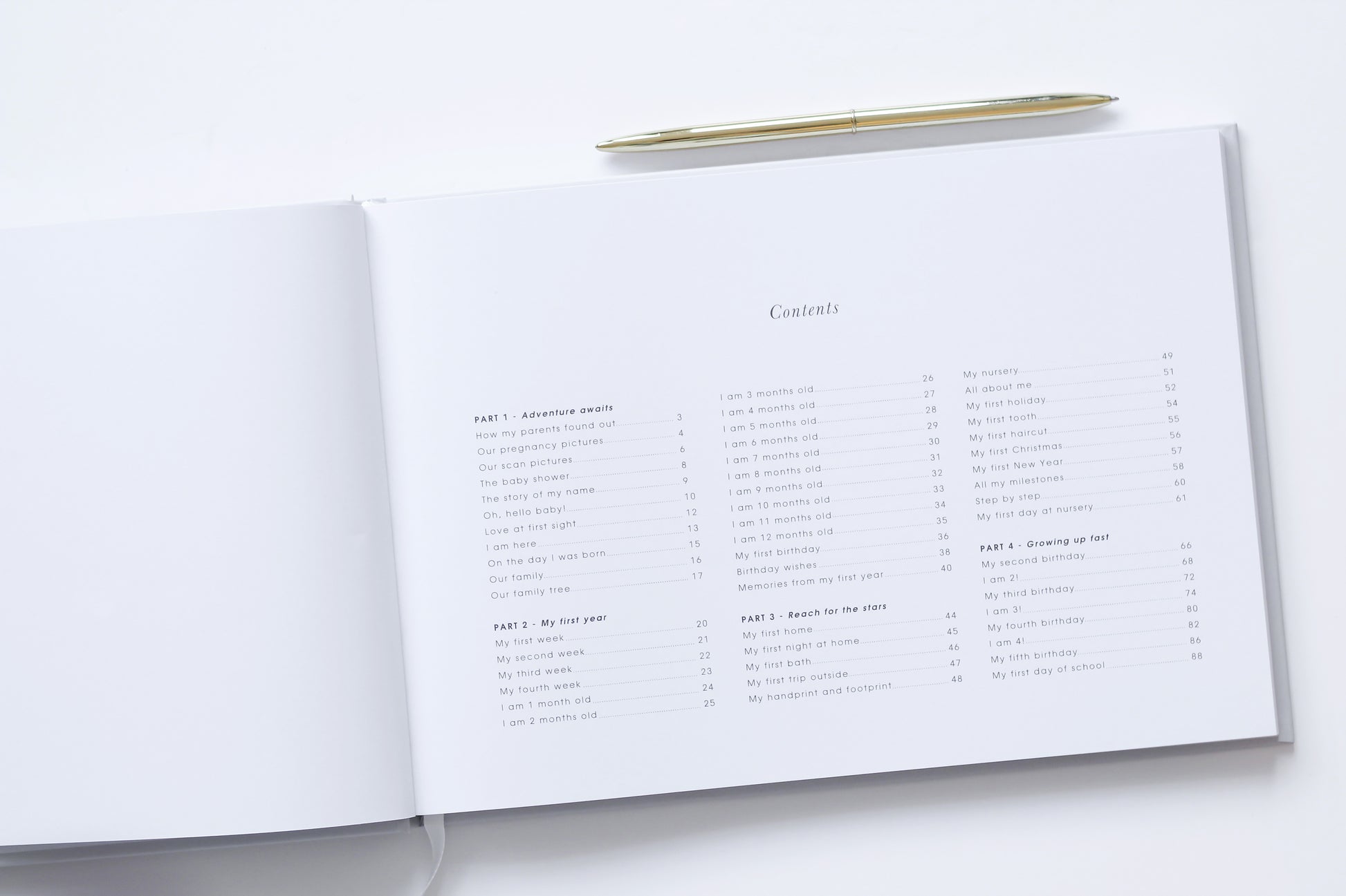A beautiful baby memory book for new parents, or soon-to-be parents, to record all those special key milestones of your new born baby (from pregnancy to 5 years).